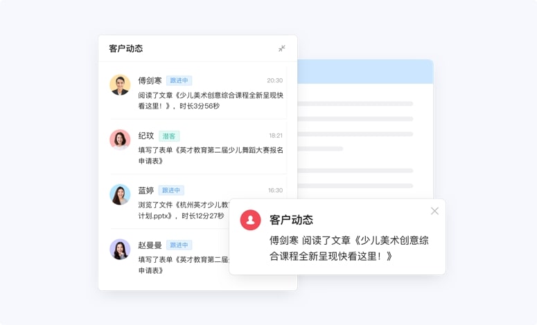 客户雷达:追踪客户行为轨迹,洞察客户需求,及时通知销售跟进;