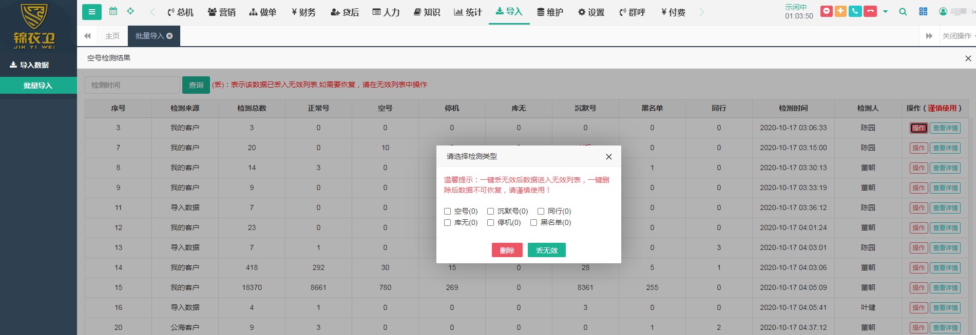 在锦蝶助贷系统,我们开放了多个空号检测功能入口,接下来通过图片给大家展示一下: